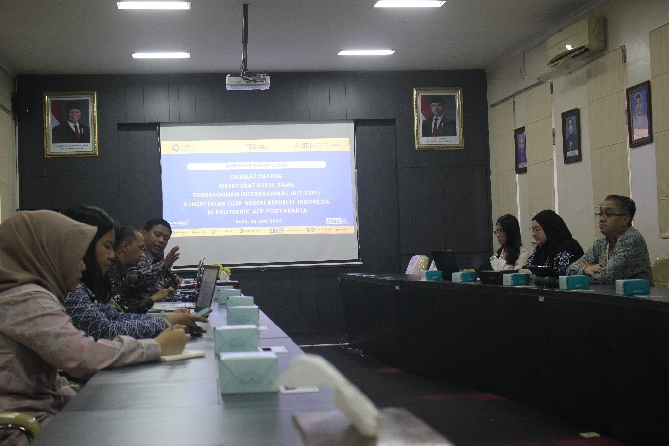 Yogyakarta, 25 Juni 2025 | Politeknik ATK Yogyakarta menerima kunjungan dari Direktorat Kerja Sama Pembangunan Internasional (Dit. KSPI) Kementerian Luar Negeri RI dalam rangka mempererat sinergi dan membahas peluang kolaborasi internasional di bidang pendidikan vokasi. Kegiatan ini berlangsung di ruang Smart Meeting dan dihadiri oleh pimpinan dan sivitas akademika Politeknik ATK serta perwakilan dari PPPVI BPSDMI Kemenperin dan Tim dari Dit. KSPI Kemenlu.